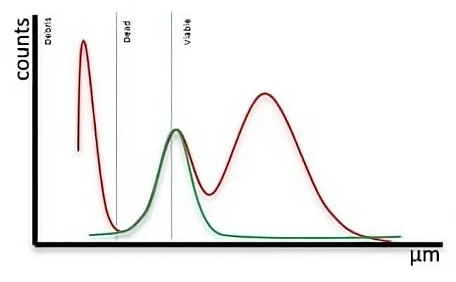 Dead cells lose membrane resistance, allowing current to pass through. Instead the much smaller volume of the nucleus is detected, which is easily distinguishable.