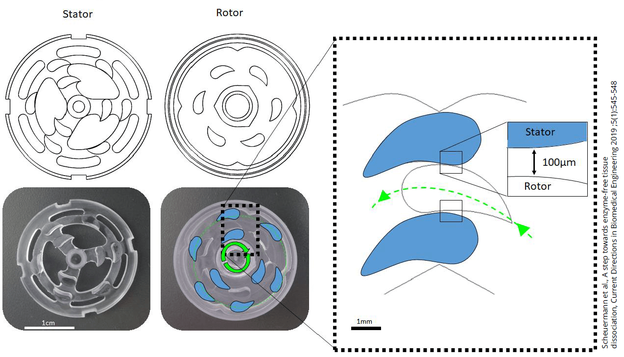 The grinding unit features interlocking rows of teeth that move against each other. As the grinding teeth rotate freely, they draw the tissue sample into the interstitial space, applying controlled shearing and milling forces to gently dissociate single cells from the tissue. The fin-shaped geometry and spacing between the teeth enable efficient isolation of viable cells. The stator remains stationary, while the rotor moves bidirectionally based on customizable programming—allowing precise, user-defined control over the tissue dissociation process.
